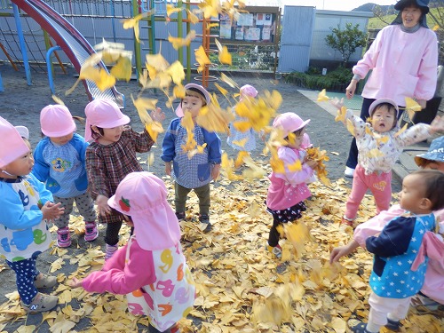 園庭のイチョウの葉で、元気に遊ぶ乳児組さん(^O^)