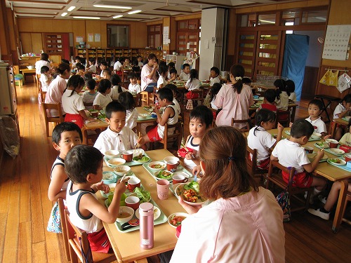7,8月は、幼児クラスは一緒に給食を食べます。
